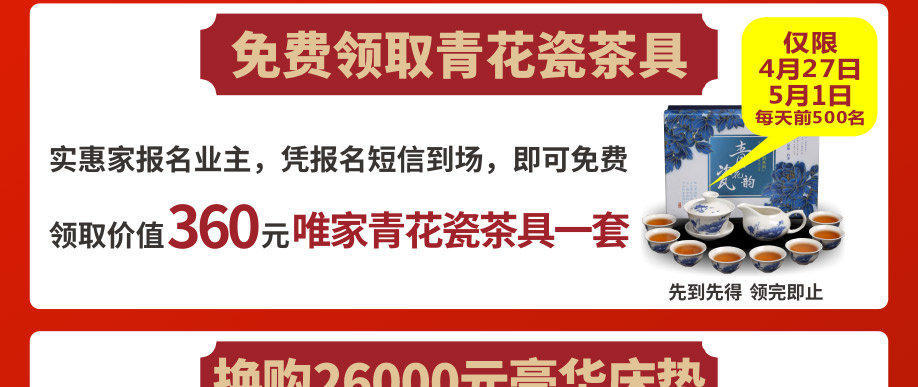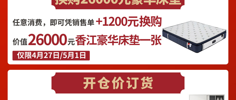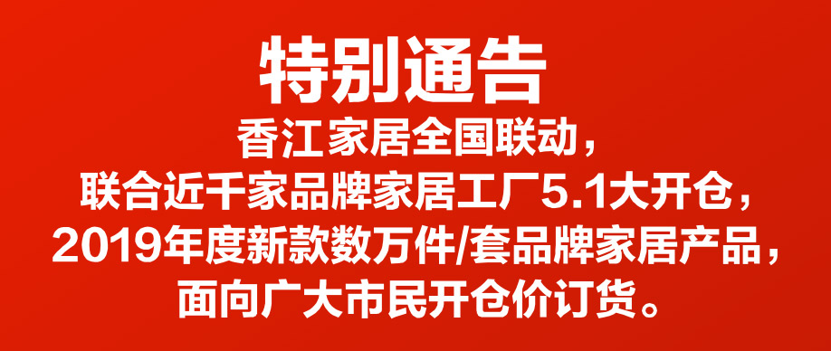 活动介绍: 【特别通告】4月27-28日,5月1-5日香江家居五一联合大开仓!近千家品牌家居工厂5.1大开仓,2019年度新款数万件/套品牌家居产品,面向广大市民开仓订货,惊爆价1折起!好家网报名免费领取价值360元青花瓷茶具,活动期间,下定再加1200元即可换购价值26000元香江家居豪华床垫;满额砸金蛋赢万元现金;再抽免单大奖;新业主买单返现金券!机会难得,赶紧报名锁定优惠!