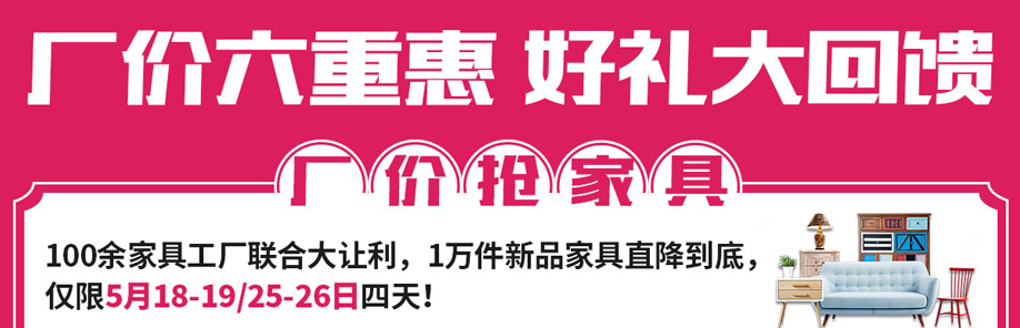 活动介绍: 5月18-19日、5月25-26日由好家网联合红树湾家具荔湾店举办的【家具厂价节 惠民狂销】大型促销活动!100余工厂联合大让利,1万件精选家具直降到底!厂价盛典,惠聚一堂,仅此4天!活动期间,领券享满额立减;满额即送家电好礼;每天前5名消费满额再送购物卡;再抽50寸液晶、微波炉等……惊喜不断,钜惠不停,还想什么,赶紧报名参与,到店享受优惠啦!