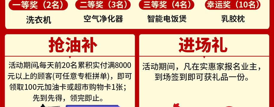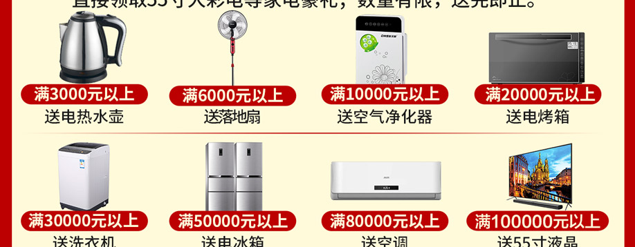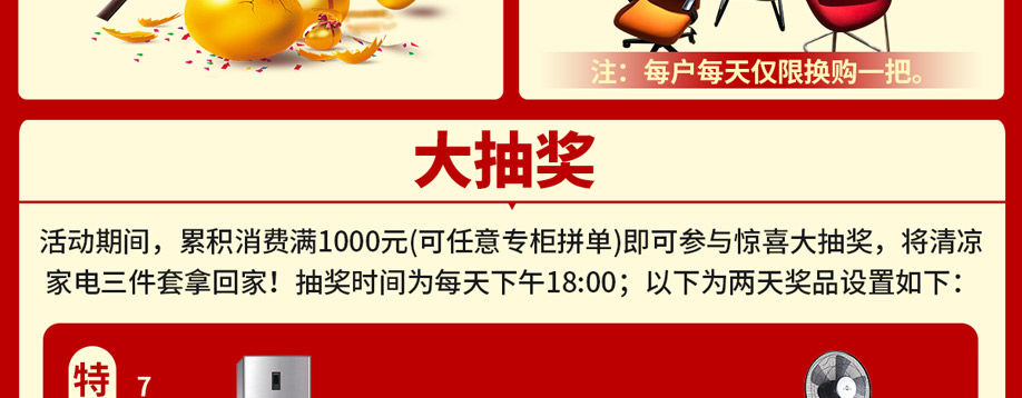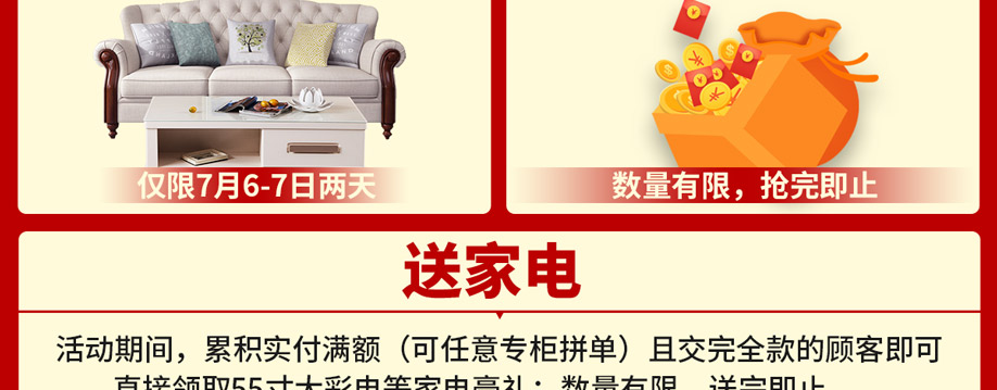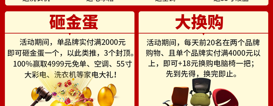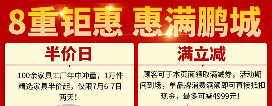 活动介绍: 家具半价日火爆来袭!7月6-7日新大明家居举办【家具半价日】大型家具促销活动!活动期间,油费补贴下单领;18元换购电脑椅;满额砸金蛋,赢4999免单;满额即送家电大礼,空调、冰箱、液晶电视豪气送;更有惊喜大抽奖赢空调+冰箱+落地扇三件套!惊喜不停,欢乐不断,抓紧时间报名,到实体店享受优惠啦!