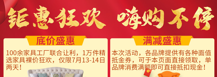 活动介绍: 【家具盛宴】来啦!7月13-14日皇家1号家居布吉店,100余家具工厂联合让利,1万件精选家具裸价狂欢;给你一场聚实惠的家具盛宴!7月13-14日,累积实付满额即送60寸液晶、空调、电冰箱等2000件家电豪礼;还可参与家庭影院、空气净化器等4轮大抽奖;另有免单4999元现金等您抱回家!多重惊喜大放送,钜惠享不停,尽在皇家1号家居布吉店,仅此7月13-14日两天!好机会不要错过!赶紧报名参与吧~