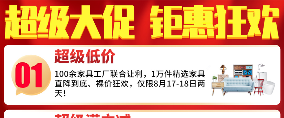 活动介绍: 家具超级盛惠来啦!8月17-18日,皇庭家具广场举办【家具超级盛惠】的大型促销活动,100余家具总部工厂联袂放价,10000件名品家具直降到底、裸价狂欢!活动期间,消费满额即可获赠58寸液晶电视等豪华家电,还可参加免单3000元大抽奖;每天前10名实付满额送加油卡,参加清凉大抽奖赢取冰箱/落地扇等;新收楼业主凭证明无需购物领取10斤大米……9重钜惠,尽在8月17-18日皇庭家具广场【家具超级盛惠】,快上实惠家报名参加活动吧!