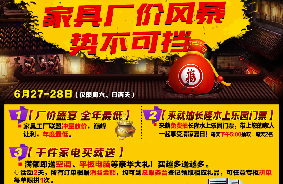 活动介绍: 6月27-28日,到万盛名家家具博览中心!家具巅峰大促,厂价风暴 势不可挡。邀您去买实惠家具,送您长隆水上乐园门票,带你嗨翻整个夏天。置家之余,乐享生活。本活动品牌云集 ,是行业独一无二的低价盛典,2天期间,全场家具极限让利,厂价特供,买满即送空调、平板电脑,更有液晶电视、消毒柜、电磁炉等大奖疯狂抽;免费接送、报名到场即送礼、免费点心……还不心动?快来 购家具,买健康,领礼品,牵幸福,抓紧报名锁定优惠哦!别把好机会留给别人!