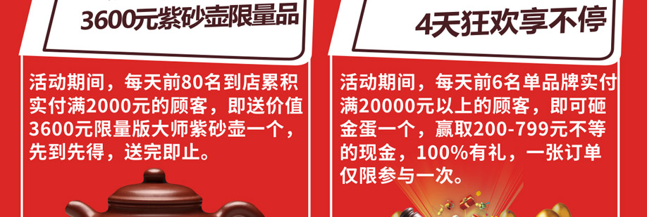 活动介绍: 10月26-27日/11月2-3日 香江家居天河店【4周年店庆】火爆来袭!全场近万件套家居品牌产品低价直销,一降到底!活动当天,进店消费即可抽现金券,进店分享活动优惠并签到即可抽现金红包;购物实付满2000元就送价值3600元大师紫砂壶一个,先到先得,送完即止!实付满额即可砸金蛋,赢取现金799元、600元等大奖!实付满5000元可抽红包1个,将现金/礼品带回家!另可参与大抽奖,有机会赢取至高4999元现金大奖!新业主还享车费补贴!报名即享优惠,赶紧报名参与吧~