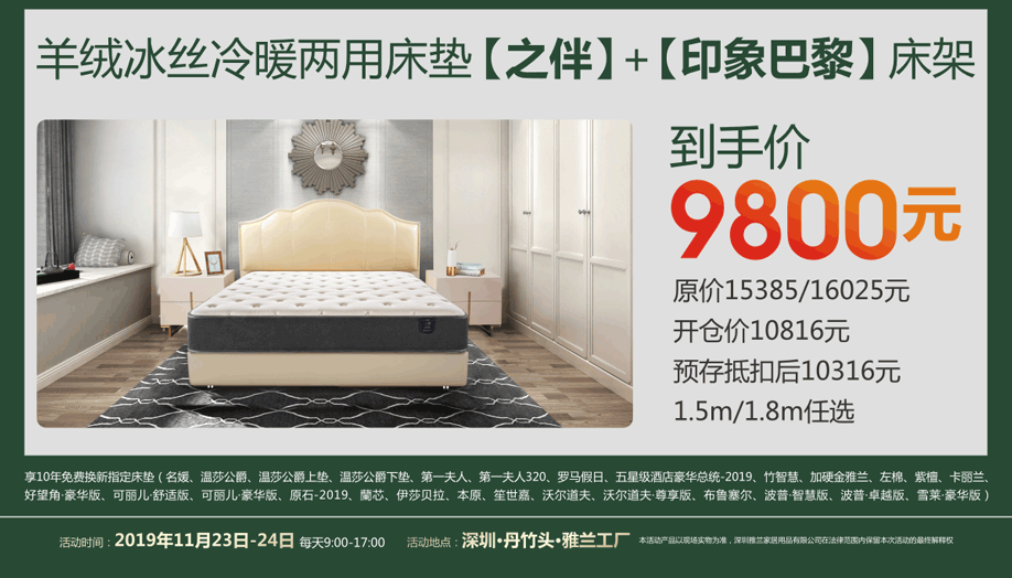 活动介绍: 11月23日-24日 雅兰工厂开仓第七季【梦享引力场 】, 超级拼团,0元得床垫;购指定床垫,免费换新,65寸品牌液晶电视满额就送!预存翻倍500抵1000;报名预付9.9元,即可以锁定名额并赠送价值168元雅兰舒适枕,还有整点抽大奖,满额砸金蛋!优惠多多,福利多多,赶紧报名锁定!