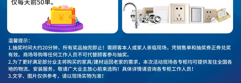 活动介绍: 11月16-17日田贝建材市场【田贝建材家装节】火爆来袭!百余家建材品牌联合让利、万款精选建材半价起!活动两天,单笔实付满额即可抽红包1个,有机会赢取华为P30pro、60寸液晶、空调、冰箱、洗衣机、现金300元等豪礼;还可参与惊喜大抽奖,现场抽出家电四件套、ipad air3、小米平衡车等豪礼带回家!所有商户免费开通“好家网集店”,活动两天通过系统实现相互带单,则顾客和推荐人均可获得50元/单的奖励,仅每天前50单;活动两天,在三楼每天实付满额的顾客即可+16元换购1件商品......更多福利,尽在活动现场,赶紧报名锁定优惠吧!