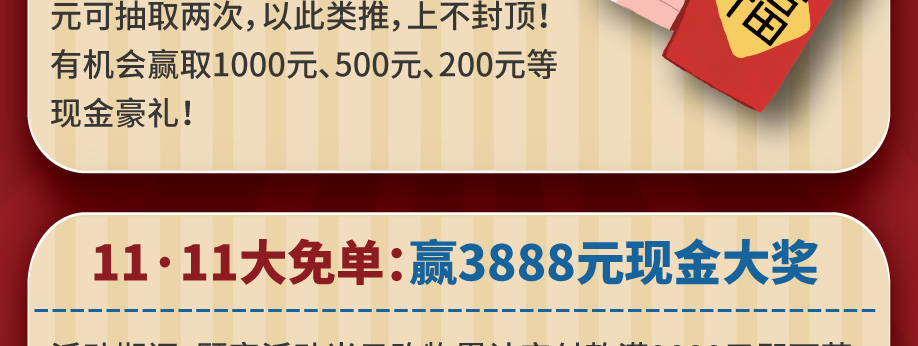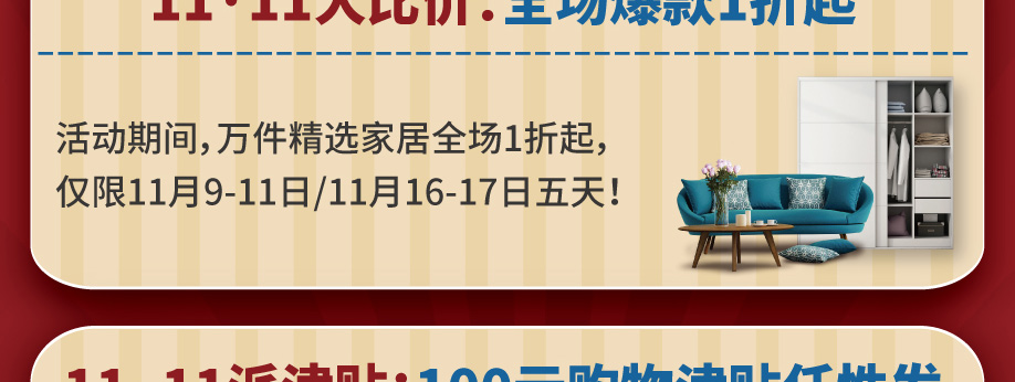 活动介绍: 11月9-11/16-17日金海马家居黄埔大道店携手好家网举办【抢占11·11】的大型促销活动!万件精选家居全场1折起;活动当日累计实付满额可获购物津贴100元现金,累计实付满额即可抽红包1次,有机会赢取1000元、500元、200元等现金豪礼;还可参与大抽奖,将3888元现金大奖带回家!赶紧报名锁定优惠吧!