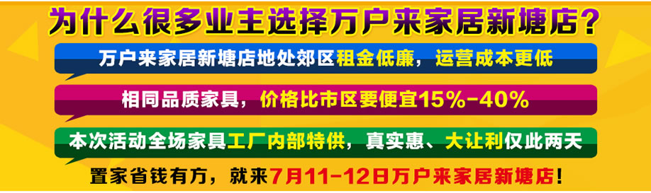 活动介绍: 7月11-12日聚焦新塘 家具超级内购会就在万户来家居新塘店!品味增城荔枝,狂抢厂价家具,再享8重超级大礼!纵享工厂内购价,0利润,给您实惠一夏;购物满额,品牌床垫免费送;再送42寸液晶电视、空调、冰箱等全屋家电,送您清爽一夏;超级大抽奖:兰博基尼拉杆箱、慕思床品等,带您疯狂一夏;凭内购卡免费抽千足黄金,精品家具1元秒,到场顾客皆有礼……真心实意,夏不为利!赶紧报名实惠家,低价高质礼品多,一起享受夏日!