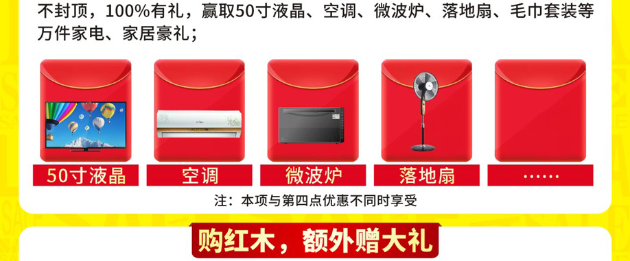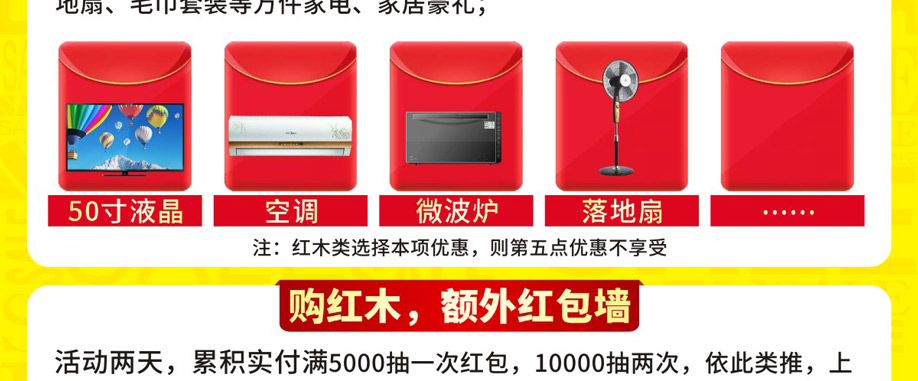 活动介绍: 5月23-24日红树湾中山大道东店携手好家网举办【节后返场大战·红木专场】大型促销活动,380家品牌工厂联袂支持,1万件红木家具狂享补贴;单品牌实付满额即返现金;实付满3000元即抽红包100%有礼,50寸液晶、空调、微波炉、落地扇等万件家电/家居豪礼;再抽免单4999元、品牌冰箱等幸运大奖!更多活动优惠,尽在活动现场,赶紧报名参与吧!