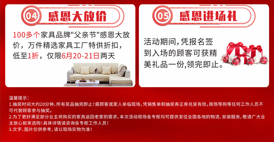 活动介绍: 6月20-21日黄石家私大广场联合实惠家举办【家具感恩节】大型促销活动,100多个家具品牌父亲节感恩大放价,万件精选家具低至1折!活动期间,工厂特供折扣放价冲量,消费满额拆红包赢取现金、家电等豪礼;再参与幸运大抽奖,将58寸液晶电视、洗衣机、冰箱、电炖锅、电磁炉等惊喜大奖搬回家!更多活动优惠,请报名后到场了解 !