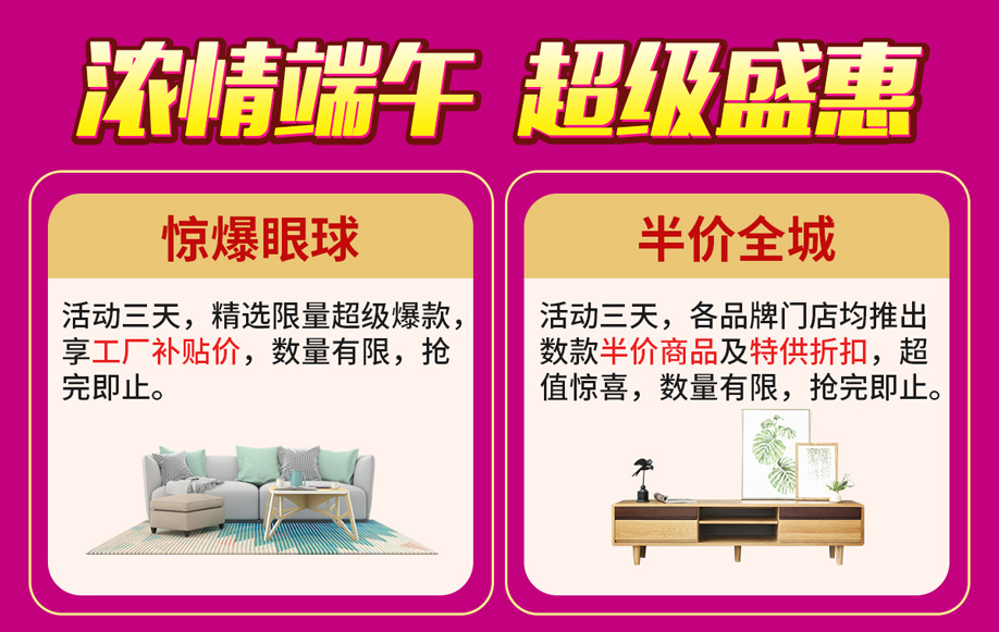 活动介绍: 6月25-27日红树湾家具花都店携手实惠家举办【超级半价日】大型促销活动,100家品牌工厂联袂放价,100万件家具狂猛一战;实付满额即拆红包100%有礼:50寸液晶、空调、微波炉、落地扇等万件家电/家居豪礼;再抽免单4999元、品牌冰箱、洗衣机等幸运大奖!还有9.9元购卡享超级特权,更多活动优惠,请赶紧报名亲临现场了解吧!