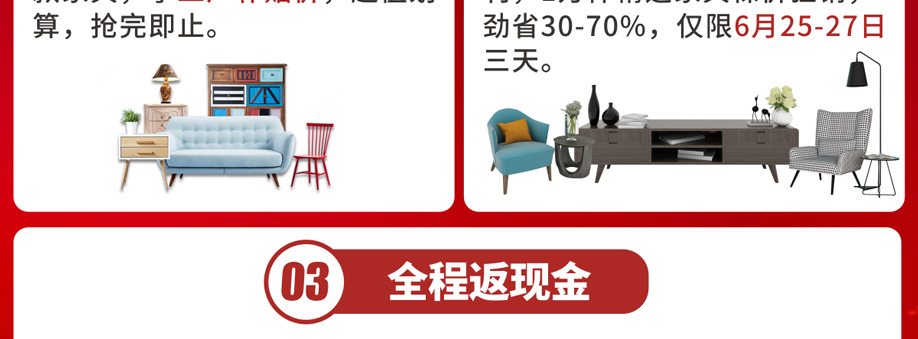 活动介绍: 家具狂欢购来啦!6月25-27日,阳光365家具广场携手家惠家举办【家具狂欢购】大型促销活动。100余家具工厂迎端午大让利,1万件精选家具裸价狂欢!活动期间下单送全屋豪华家电+油卡,掷骰子赢现金,还有惊喜大抽奖,将冰箱、洗衣机等大奖拿回家!多重活动优惠尽在6月25-27日阳光365家具广场,马上报名参与活动吧!