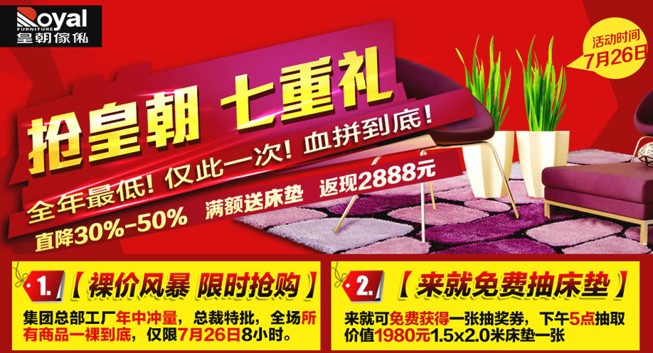 活动介绍: 抢皇朝家具啦!!应广大业主强烈要求,好家网与皇朝家私集团总部经过半年精心筹备,定于7月26日举办皇朝家私8小时裸价风暴促销活动。本次活动直赴皇朝集团总部工厂,工厂开仓直供,皇朝家私总裁特批价,直降30%-50%!活动当天,满额即送进口床垫等,买越多送越多;下单达到指定单数,还可享受折上再折;最高返现2888元;精品家具1元换购等……还有奥运金牌、ipad mini等大奖等你抽回家!皇朝家私开仓盛典你非来不可,限时抢购,后惠无期,赶紧报名实惠家参与吧!