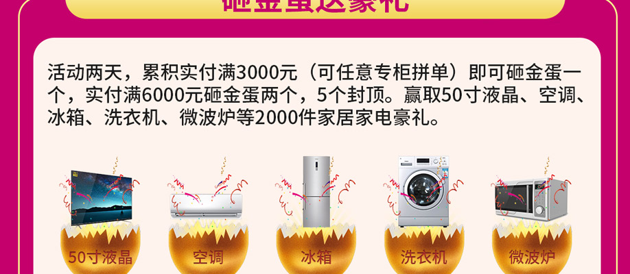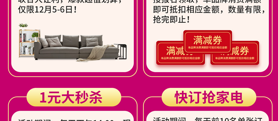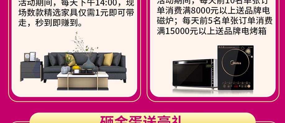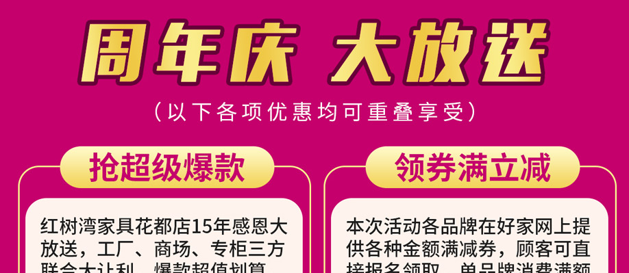 活动介绍: 抢超级爆款、领券满立减、1元大秒杀、快订送家电、抽家电大奖……钜惠尽在12月5-6日红树湾家具花都店举办的【15周年庆】大型促销活动!活动期间,全场家具大放价;快订再送电烤箱、电磁炉;砸金蛋赢取50寸液晶、空调、冰箱、洗衣机等2000件家居家电豪礼;再抽家电大奖;参与互动再送豪礼,更多活动优惠,请赶紧报名亲临现场了解吧!