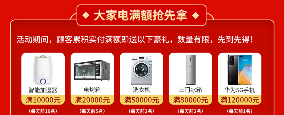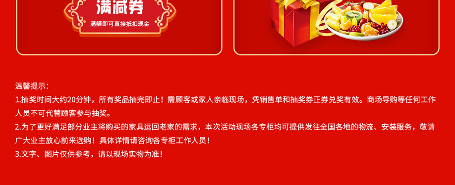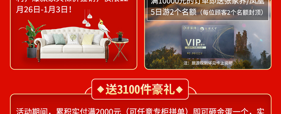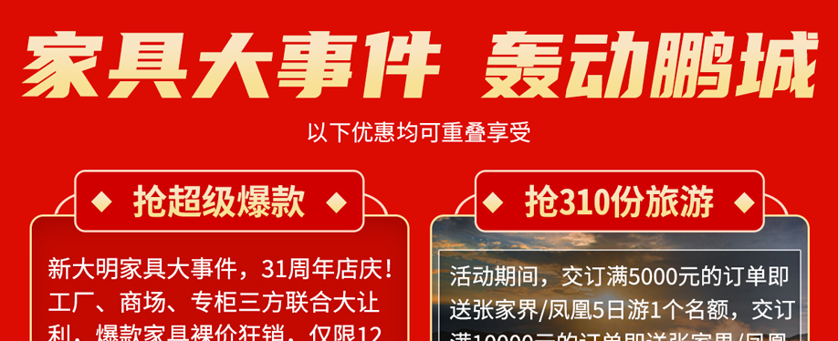 活动介绍: 12月26日-1月3日新大明家居盛大举办“31周年店庆”大型促销活动,全场爆款家具裸价狂销,领31万满减券,再送3100件家居家电豪礼;抽4999元免单;抢310份张家界+凤凰五日游;华为5G手机满额抢先拿……赶紧报名参加吧!