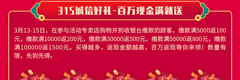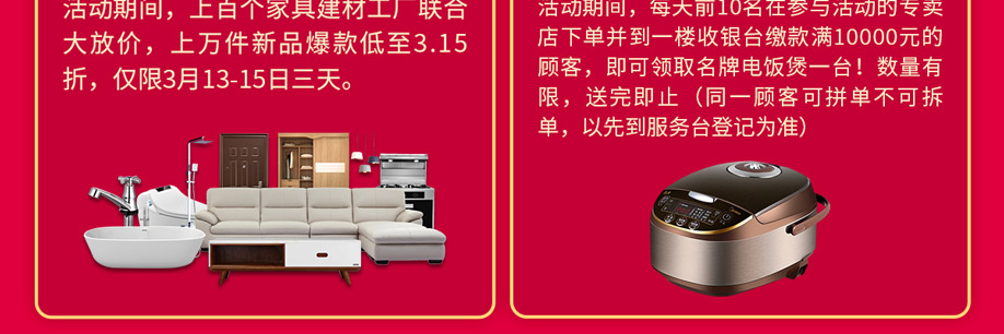 活动介绍: 3月13-15日慧聪欧亚达家居商场携手实惠家举办【开年大促 礼献315】大型促销活动,百余品牌家具建材工厂联合大放价,上万件新品爆款低至3.15折,满额即返百万现金,送家电豪礼,再抽4999元现金大奖!更多活动优惠,请赶紧报名亲临现场了解吧!