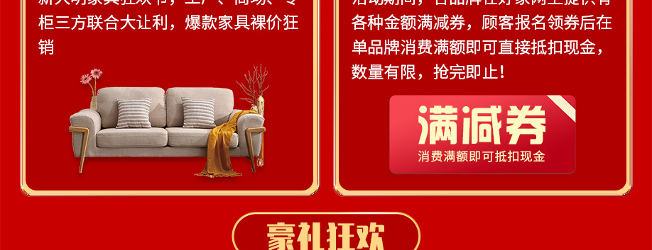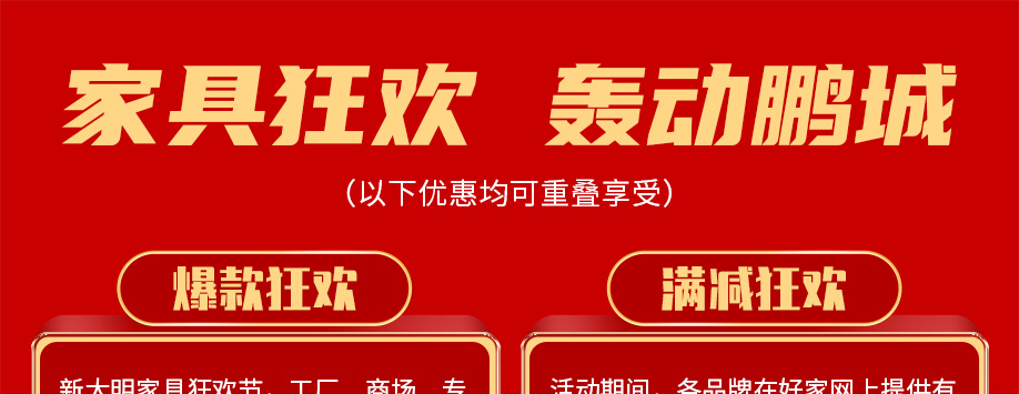 活动介绍: 7月24日-8月1日新大明家居“家具狂欢节”,全场爆款家具裸价狂销,送3000件家居家电豪礼;领券满额立减;抽家电套餐;抢三省联游双人游;华为5G手机满额抢先拿……赶紧报名参加吧!
