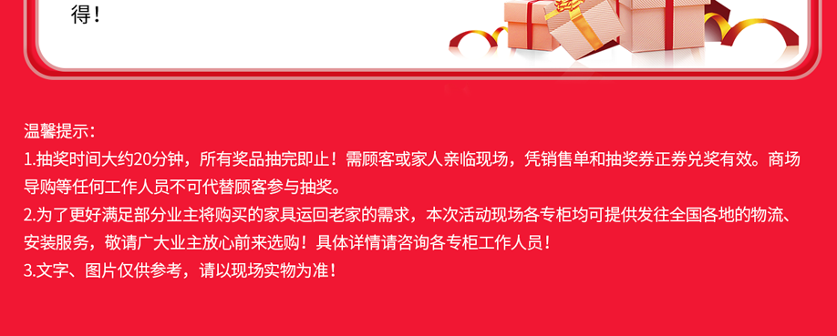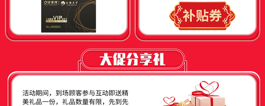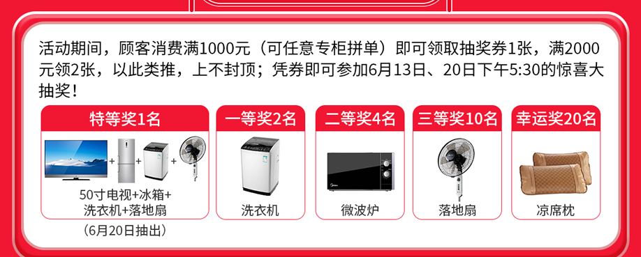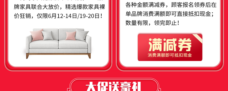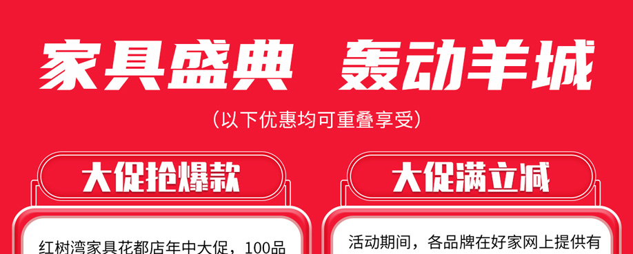 活动介绍: 超级爆款、领券满立减、大促送豪礼、大促赠旅游、抽家电套餐大奖……钜惠尽在6月19-20日红树湾家具花都店携手实惠家举办的【年中大促 惠战到底】大型促销活动!活动期间,全场家具大放价;满额送液晶电视、冰箱、洗衣机等家电豪礼;再抽家电四件套大奖;送三省联游双人游……更多活动优惠,请赶紧报名亲临现场了解吧!