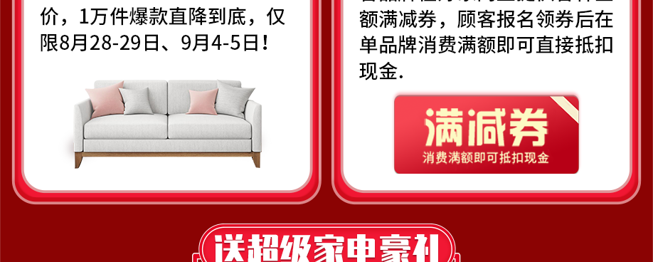 活动介绍: 9月4-5日红树湾家具花都店携手实惠家举办的【家具超级盛惠】大型促销活动!活动期间,100家工厂冲量放价,1万件爆款直降到底;满额送洗衣机、微波炉等家电豪礼;再抢现金红包;抽免单4999元大奖……更多活动优惠,请赶紧报名亲临现场了解吧!