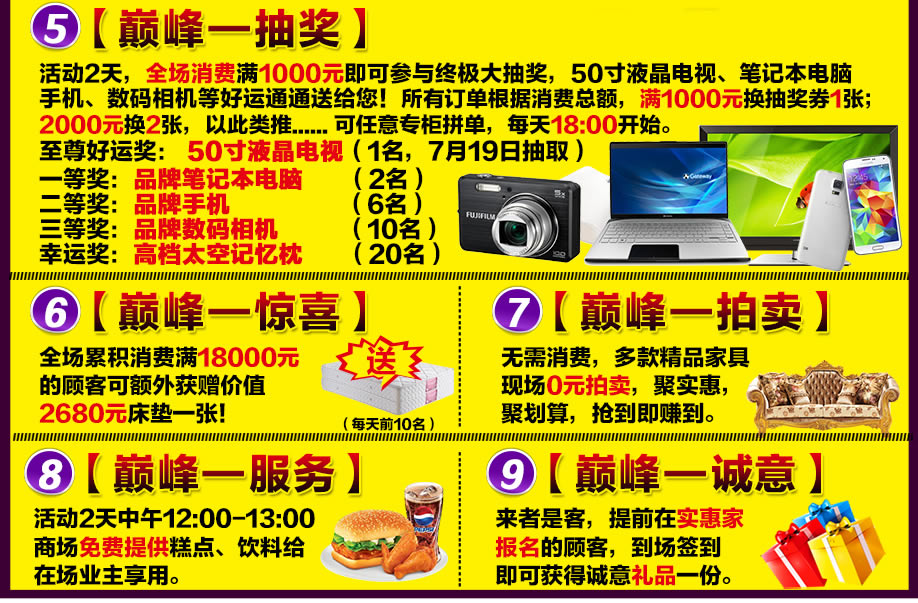 活动介绍: 7月18-19日南岗光辉携手好家网,倾情打造“家具巅峰抄底日”,低价风暴,席卷而来!光辉家居连锁商场,行业老字号,品质好,服务优,值得信赖!巅峰抄底,击破底线,冰点价格,挑战全城!活动2天,巅峰豪礼乐享不停!来就抽长隆门票,买就抽现金,满额即送iphone6,再抽50寸液晶;另有巅峰大秒杀;免费床垫惊喜送;巅峰拍卖等环节,聚划算,聚实惠!7月18-19日来南岗光辉巅峰聚惠抢购到底,错过即是过错,赶紧报名实惠全程免费参与!