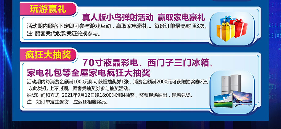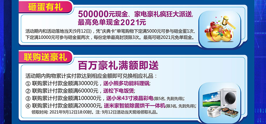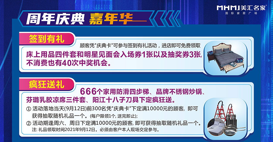 活动介绍: 东莞美汇名家家居建材广场携手实惠家举办【周年庆典嘉年华】大型促销活动!预约庆典卡送床上用品四件套加3张抽奖券;下定送家具家电现金好礼;砸金蛋赢50万现金;联购送家电;抽70寸液晶彩电等大奖......周年庆嘉年华,壕礼狂送!各种惊喜、豪礼享不停!赶紧报名参与吧。