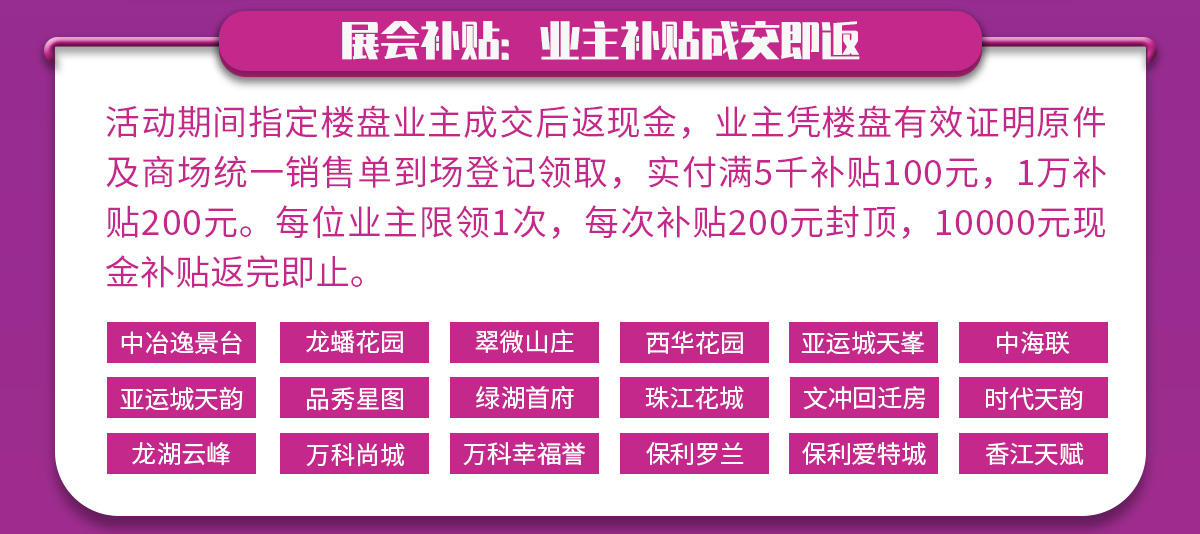 特别提示:应举办方规定,实惠家是本次活动指定报名登记渠道,所有参与业主须在本页面(上方左侧或下方图标)报名,报名登记成功方可享受活动的所有优惠环节,活动前会有客服致电告之详情。如对报名成功与否有疑问,可致电020-32038939查询→。