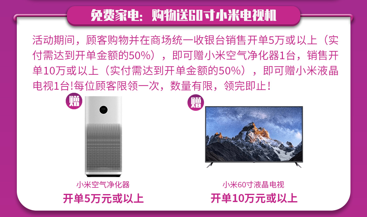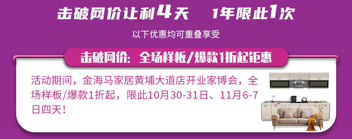 活动介绍: 全场爆款1折起,现金补贴、抽现金红包、送60寸小米电视机,抽4999元现金大奖……钜惠尽在11月6-7日金海马家居黄埔大道【开业家博会】活动!更多优惠赶紧报名参与吧!