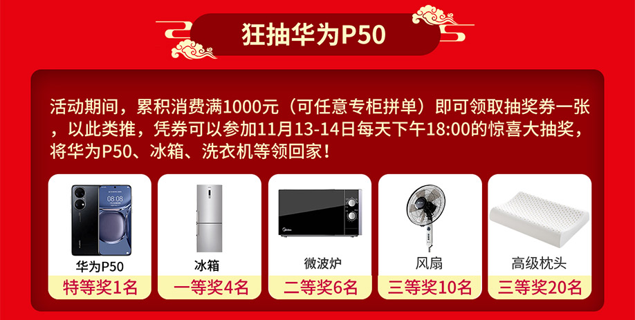 活动介绍: 狂抽华为P50,派100万满减券,砸金蛋赢1314元,送1000台家电,赠200份旅游......