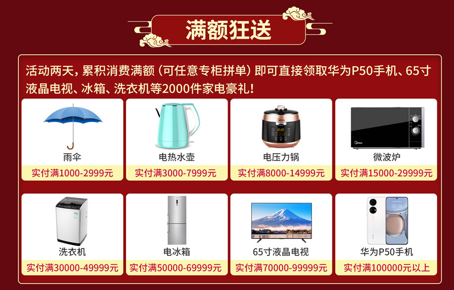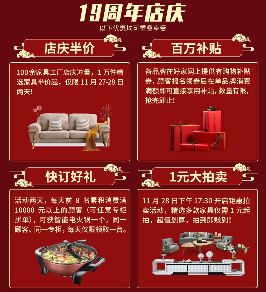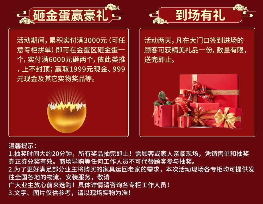 活动介绍: 11月27-28日 公明松宝大家具【19周年店庆】狂欢三天!松宝大家具联合商户、家具工厂大让利,100余家具工厂店庆冲量,1万件精选家具半价起!活动期间,实付满额狂送家电,华为P50手机、70寸液晶、空调冰箱洗衣机带回家!砸金蛋赢1999元现金,还有现场惊喜大抽奖,免单4999元/冰箱/洗衣机/你来拿!报名到场签到即送精美礼品……更多福利,尽在活动现场,赶紧报名锁定优惠吧!