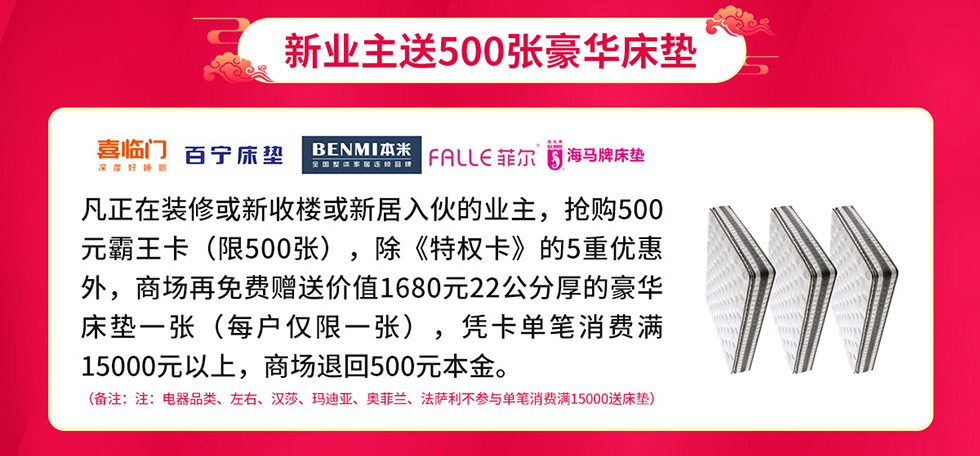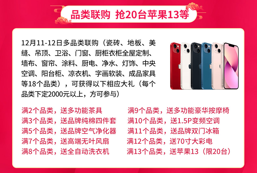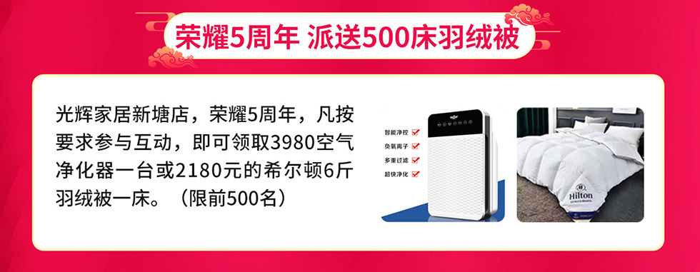 活动介绍: 荣耀5周年派送500床羽绒被,50元特权卡锁定5重优惠,新业主送500张豪华床垫,砸金蛋赢家电大奖,品类联购抢20台苹果13等,终极抽苹果13手机……钜惠尽在12月11-12日光辉家居CBD新塘店【狂猛家博会暨5周年庆典】活动!更多优惠赶紧报名参与吧!