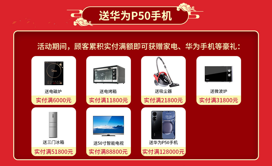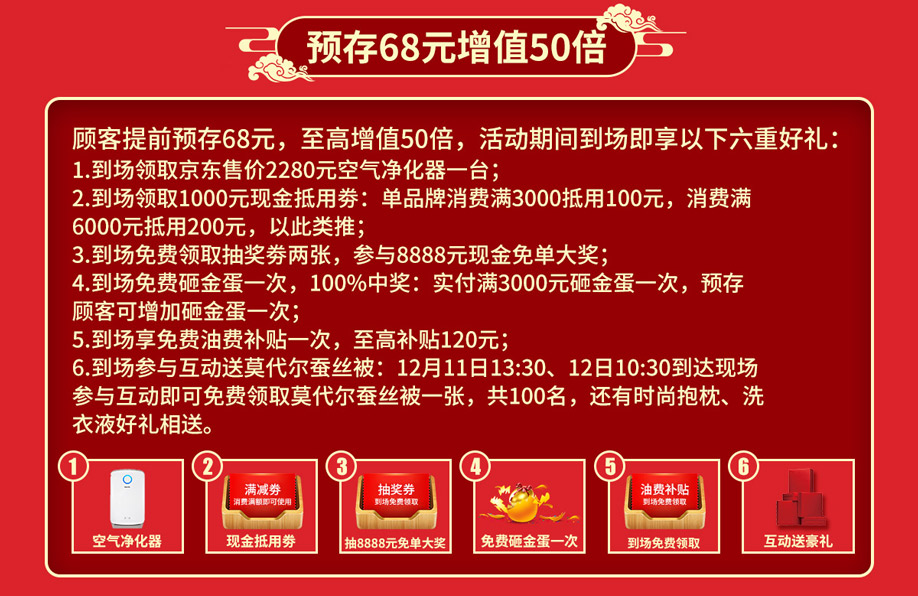 活动介绍: 预存68元增值50倍免费领空气净化器一台,抽8888元现金,送100台70寸电视,送华为P50手机,送100床莫代尔蚕丝被,名品让利疯狂购!各种惊喜、豪礼享不停!赶紧报名参与吧。