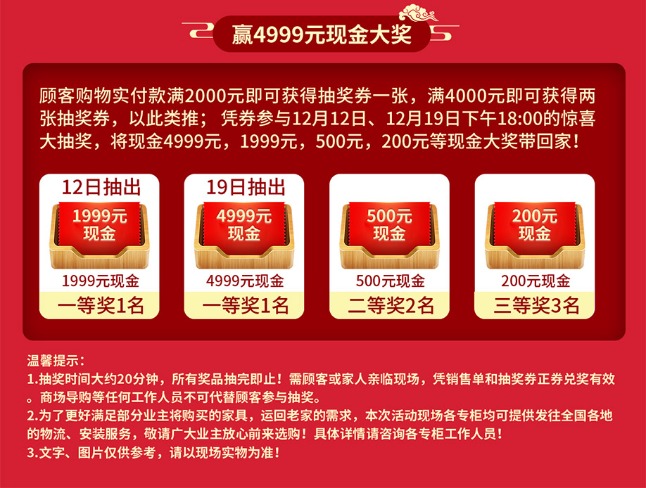 活动介绍: 全场爆款大降价,抽现金红包、转799元现金、赢4999元现金大奖……钜惠尽在12月18-19日维亚金海马金海马家居黄埔大道【12.12大促】活动!更多优惠赶紧报名参与吧!