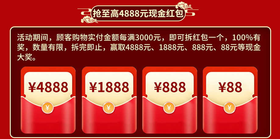 活动介绍: 赢8888元团年饭礼金、抽豪华家电、抢4888元红包、赠300份双人游等……活动5天,惊钜惠不断,赶紧报名参加吧!