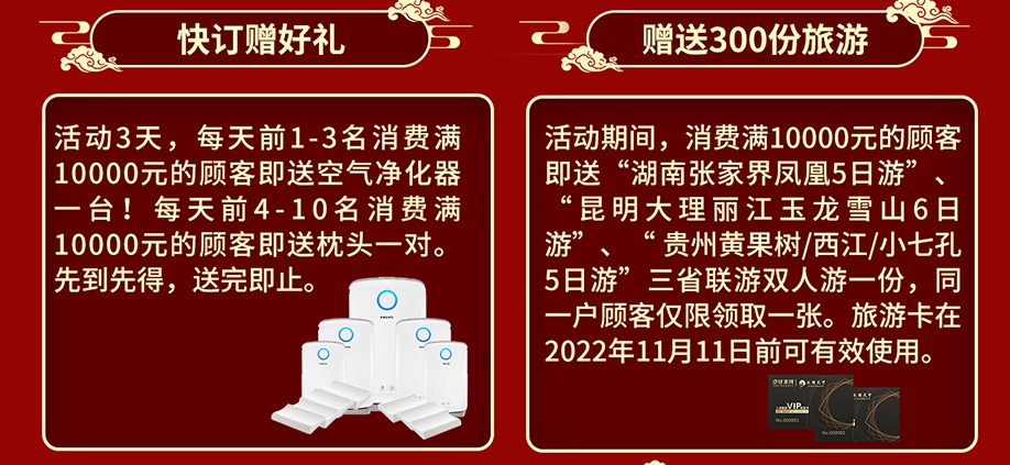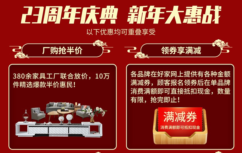 活动介绍: 380余家具工厂联合放价,10万件精选爆款半价惠民,快订赠好礼,购卡享周年礼,砸金蛋赢大礼、转幸运大转盘、抽8888元大奖、赠300份旅游、满额+1元购、进场有礼……更多钜惠,尽在1月1-3日恒锋家居联合好家网隆重举办【23周年庆典 新年大惠战】大型促销活动,请您抓紧时机报名后亲临现场了解!