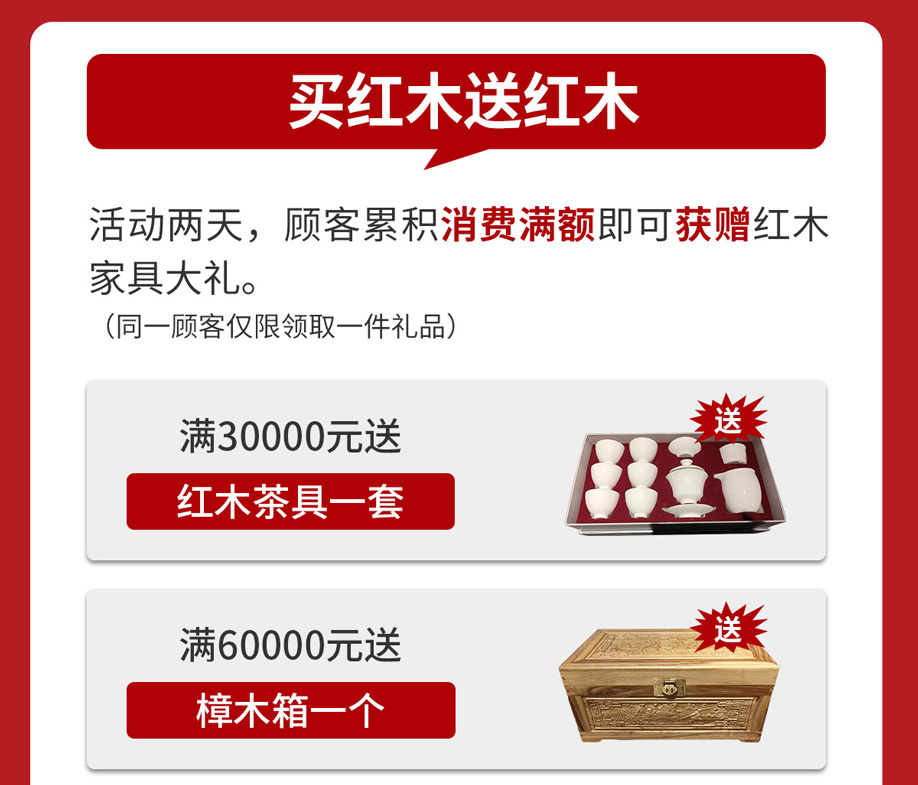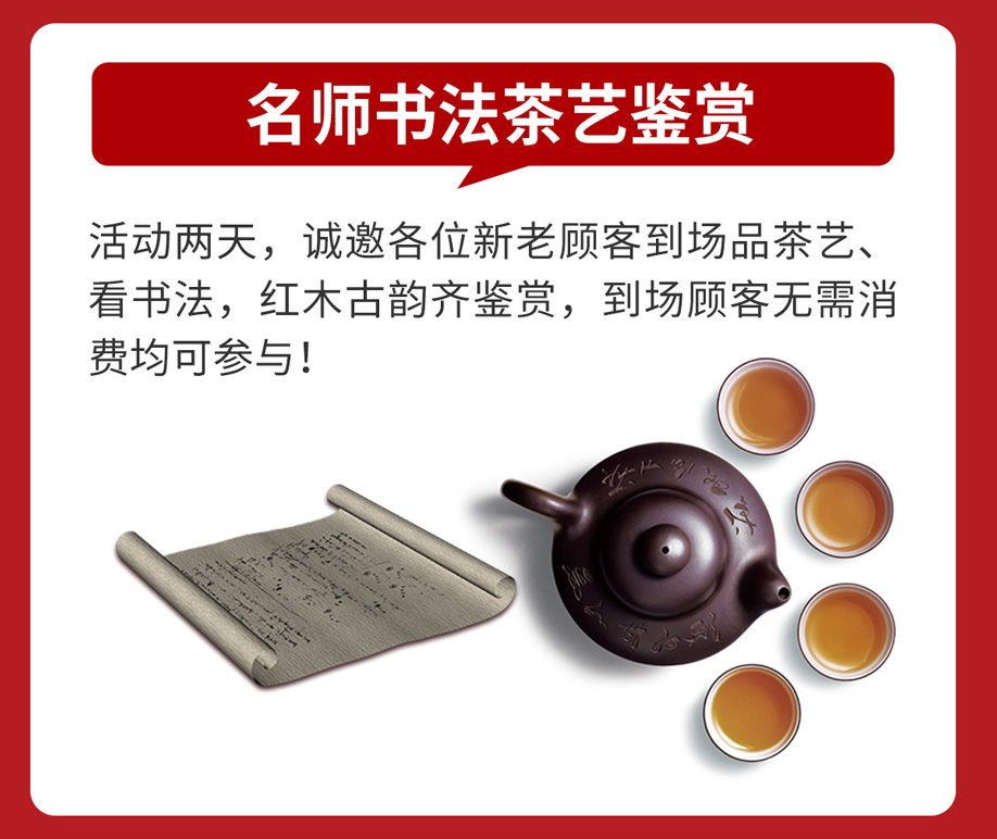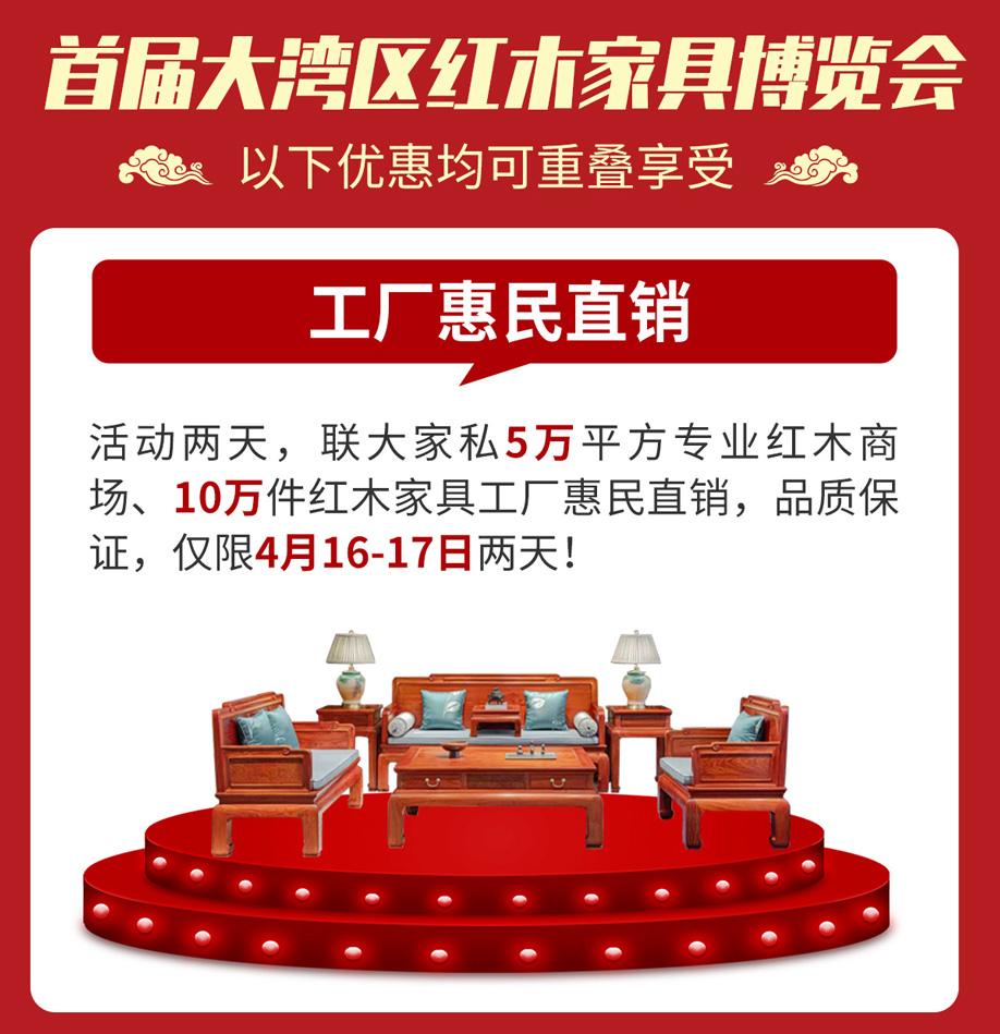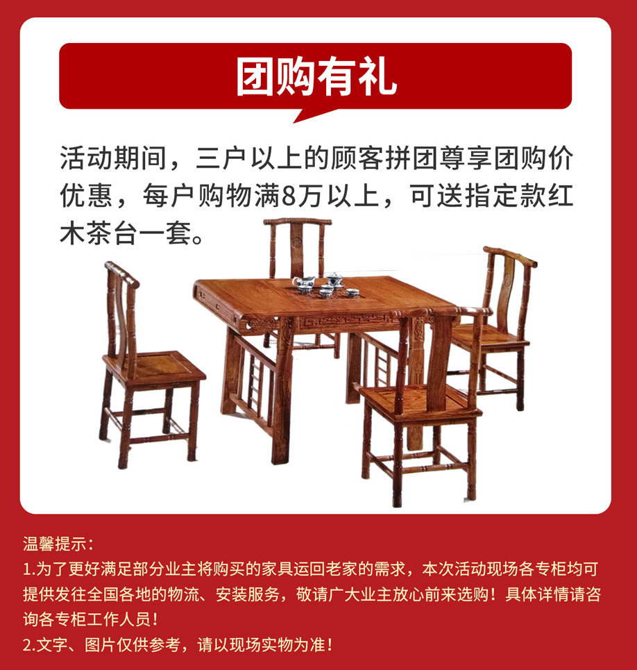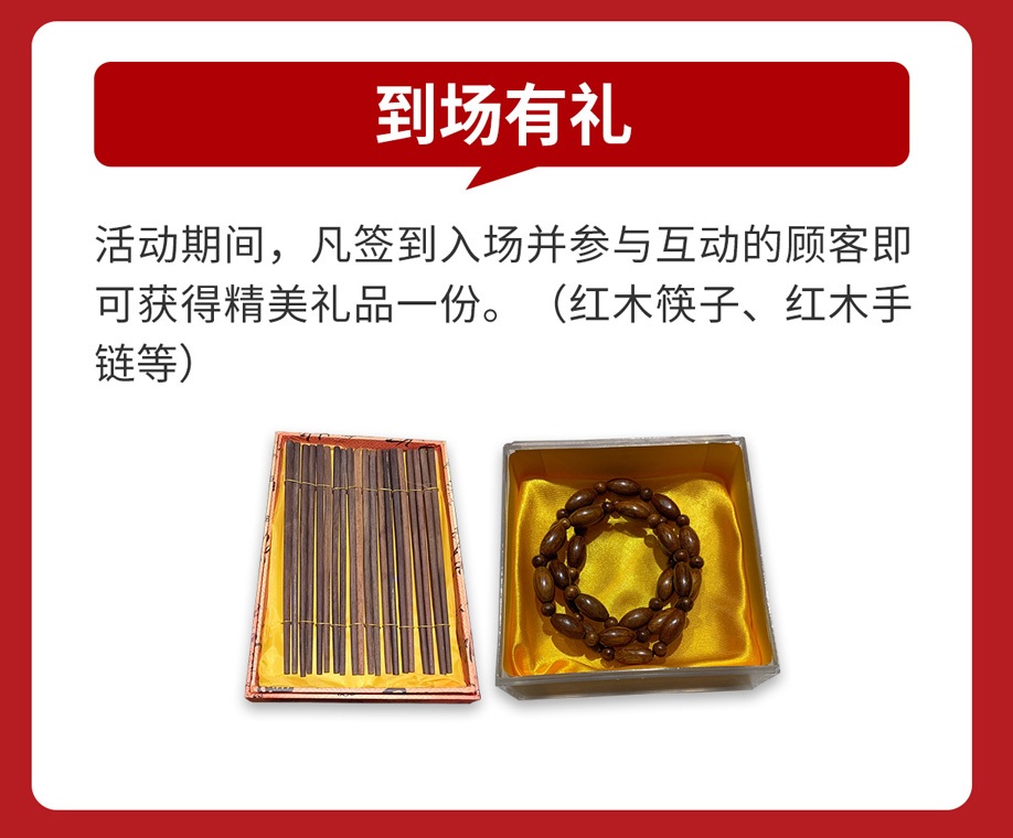 活动介绍: 10万件红木家具工厂价惠民直销、名师书法茶艺鉴赏、砸金蛋赢豪礼、买红木送红木、自驾消费领油补、到场有礼、团购尊享礼!更多活动优惠,请赶紧报名亲临现场了解吧!