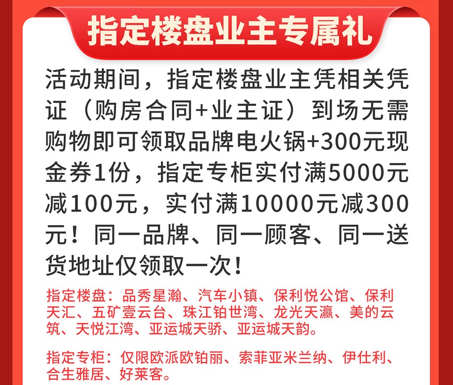 特别提示:应举办方规定,实惠家是本次活动指定报名登记渠道,所有参与业主须在本页面(上方左侧或下方图标)报名,报名登记成功方可享受活动的所有优惠环节,活动前会有客服致电告之详情。如对报名成功与否有疑问,可致电020-32038939查询→。