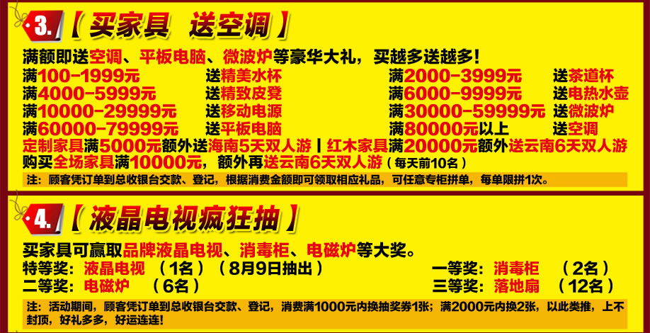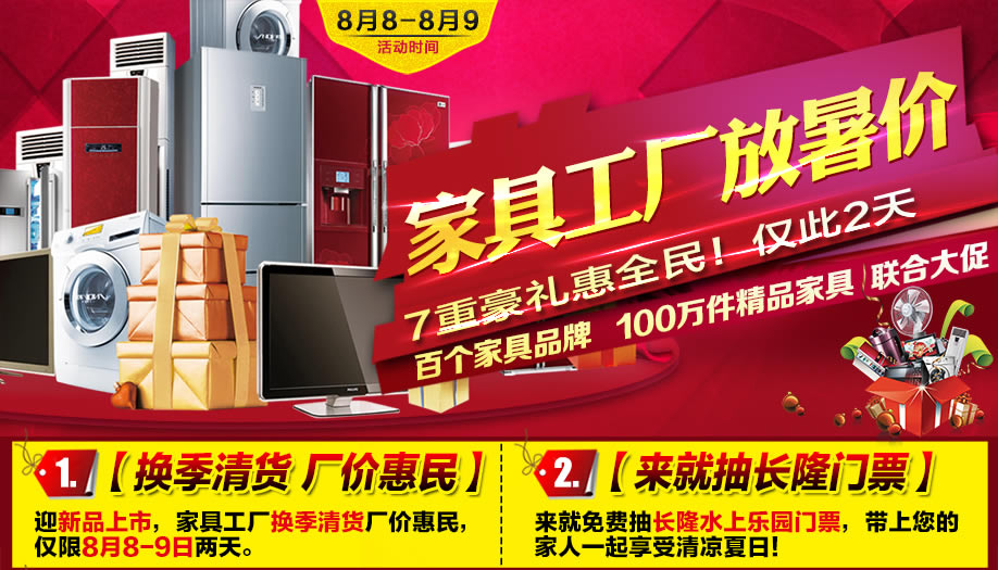 活动介绍: 8月8-9日万盛名家家具博览中心!家具厂价惠民日,迎家具展新品上市,工厂换季清货,厂价风暴 势不可挡,仅此2天。工厂放暑价,真情邀您去买实惠家具,享受不一样的暑价。置家之余,乐享生活,好家具好生活。本活动品牌云集 ,给您不一样的超低价,全场家具极限让利,厂价特供,送您长隆门票,带你嗨翻整个夏天,买家具送豪华家电,再送云南、海南游;买好家具,绿色家具,买的就是实惠,买的就是健康,抓紧报名锁定优惠哦!别把好机会留给别人!