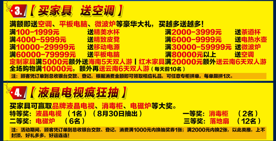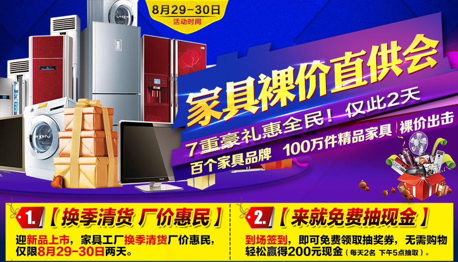 活动介绍: 8月29-30日万盛名家家具裸价直供会,由实惠家与万盛名家家具联合举办,工厂联合大促,百个家具品牌,聚集百万件精品家具,裸价全力出击,挥去炎热夏天,迎接金秋时节。新品上市,为您们提供更多的选择;工厂换季清仓,为您提供更多的优惠,仅此两天,千万别错过了。来就免费抽现金,现场签到即可免费领取抽奖券,买家具送豪华家电,满额再送海南/云南游,只要您满足条件就有豪礼相送,别再犹豫了,马上报名参加活动。
