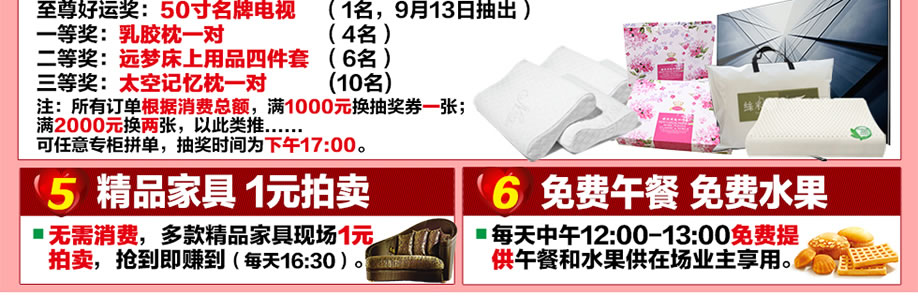 活动介绍: 舞动全城的家具大抢购开始啦!工厂真实惠大让利热潮来袭,应广大业主响应,在9月12-13日(仅此2天)与业主们一起舞动全城。本次活动工厂特供,10000平米的工厂展厅,16大系列产品种类,高品质家具直降50%,超低来袭,非来不可。实惠家报名就送1.8L食用油,买满额就送品牌家电,空调、电视、冰箱、床垫等等你来拿,买满就可以玩转2轮大奖循环抽,还有千件好礼满等你来...,品质消费,售后保障,赶紧报名锁定优惠折扣吧!!