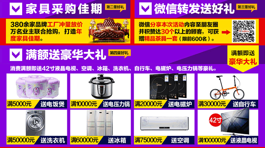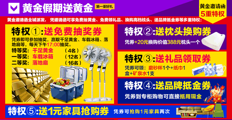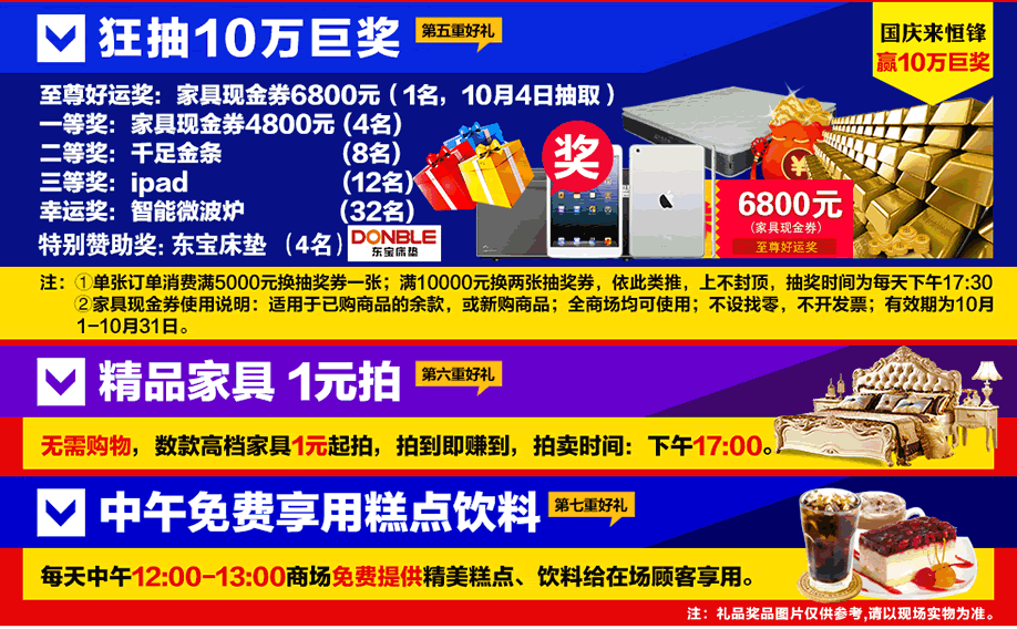 活动介绍: 10月1-4日,【国庆大惠战,家具聚划算】,将在东莞厚街恒锋家具博览中心盛大上演!东莞厚街是全国家具重镇,家具生产批发中心,而恒锋家具博览中心,更是家具重镇的重中之重!恒锋家具博览中心,喜迎国庆,与您同庆:10万方工厂直营门店,380家品牌家具工厂联合放价。来就免费抽千足黄金、车载冰箱,满额再送42寸液晶电视、空调、冰箱等家电;消费满5000元,再抽10万元巨奖;还有凭邀请函+20元可换购高档记忆枕、送精美礼品,还送现金抵用券,另有精美糕点、免费接送……10月1-4日,国庆买家具聚划算,就在恒锋家居!