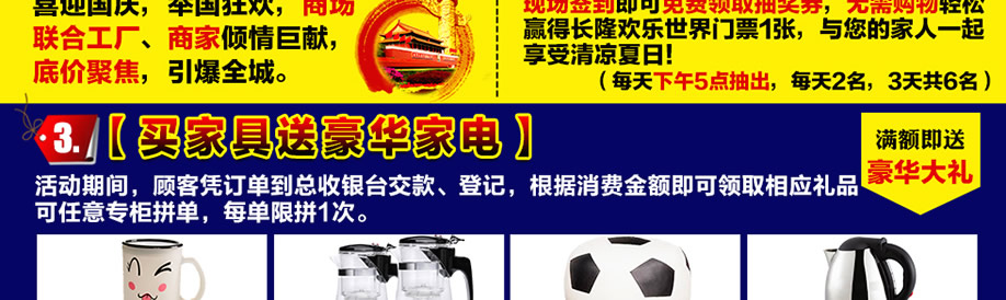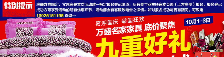 活动介绍: 应广大业主响应,10月1-3日实惠家再次与万盛名家家具联合举办万盛名家家具底价聚焦 引爆全城活动,满足业主们要求。喜迎国庆,举国狂欢,商场联合工厂、商家倾情巨献,底价聚焦,引爆全城。家具工厂喜迎国庆,百万款精品让利惠民,超级实惠,来就抽长隆欢乐世界门票,满即送豪华家电,云南双人游、海南双人游、空调、平板电脑、微波炉等豪礼,再抽现金+家电大奖,好礼多多,实惠多多,买到即赚,马上报名锁定我们的优惠。