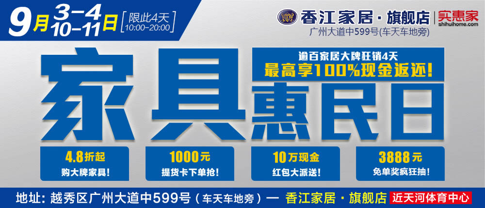地址:广州市越秀区广州大道中599号-香江家居旗舰店(车天车地旁,广州大道中公交站)
