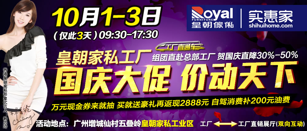 地址:广州市增城仙村五叠岭皇朝家私工业区工厂←→工厂直销展厅双向互动