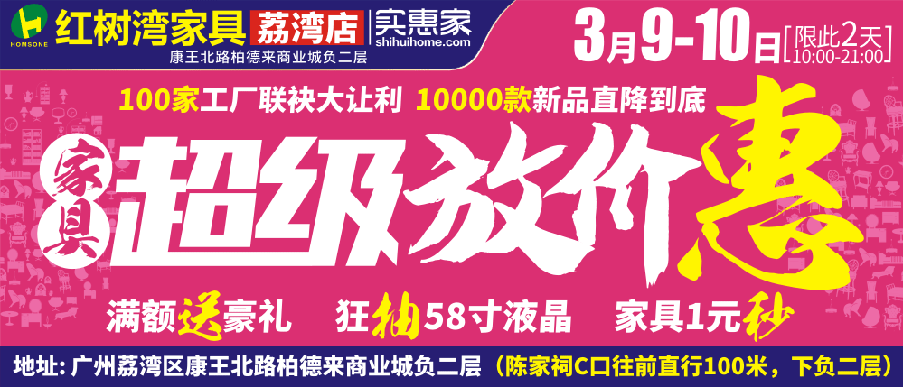 地址:广州市荔湾区康王北路柏德来商业城负二层--红树湾家具(地铁1号线陈家祠站C口往前直行100米,下负二层)