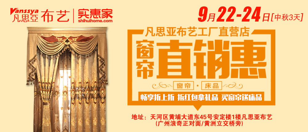 地址:天河区黄埔大道东45号安定楼1楼凡思亚布艺(广州浪奇正对面/黄洲立交桥旁); 自驾导航:凡思亚布艺;乘车:地铁4/5号线车陂南站C出口(出地铁口左拐至黄埔大道“迅发装饰材料城“往东步行30米)