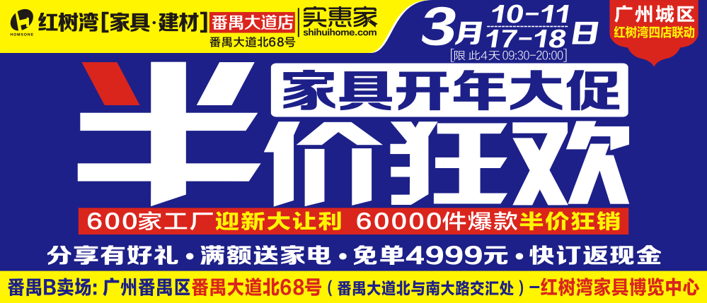 地址:广州市番禺区番禺大道北68号/番禺大道北与南大路交汇处-红树湾家具博览中心(地铁3号线厦滘站B出口有免费小巴接送)