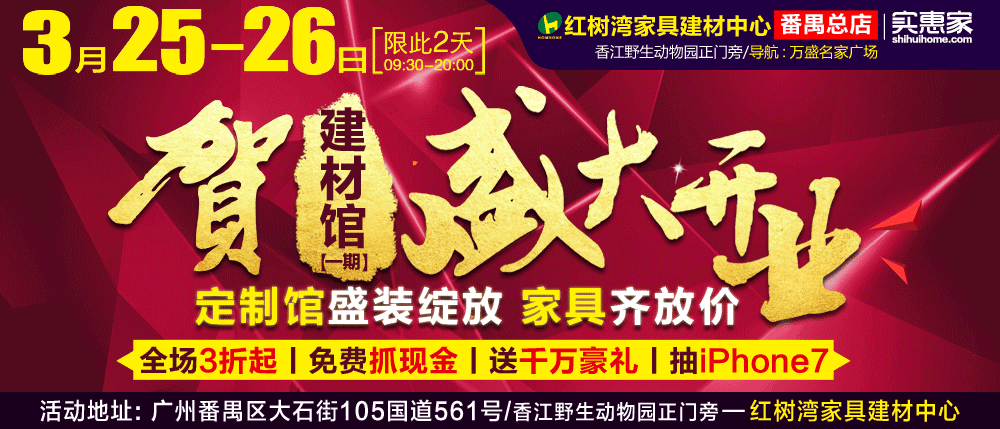地址:番禺区大石街105国道561号-红树湾家具建材中心(香江野生动物园正门旁)