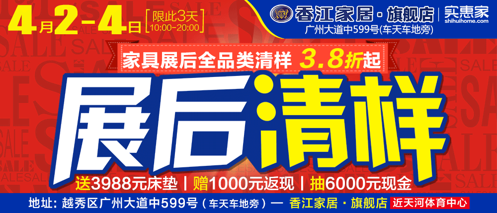 地址:广州市越秀区广州大道中599号-香江家居旗舰店(车天车地旁,广州大道中公交站)